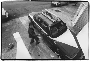 "The real goal was to try and show what it's like to be a cab driver," he says. Roden shoots most of his photos without looking through the viewflnder. He spins around and asks a fare if she would mind having her photo taken. Then he simply extends his arm, Nikon in hand, and snaps a shot. His bearded and sunglassed mug often appears in the corner of many photos.
